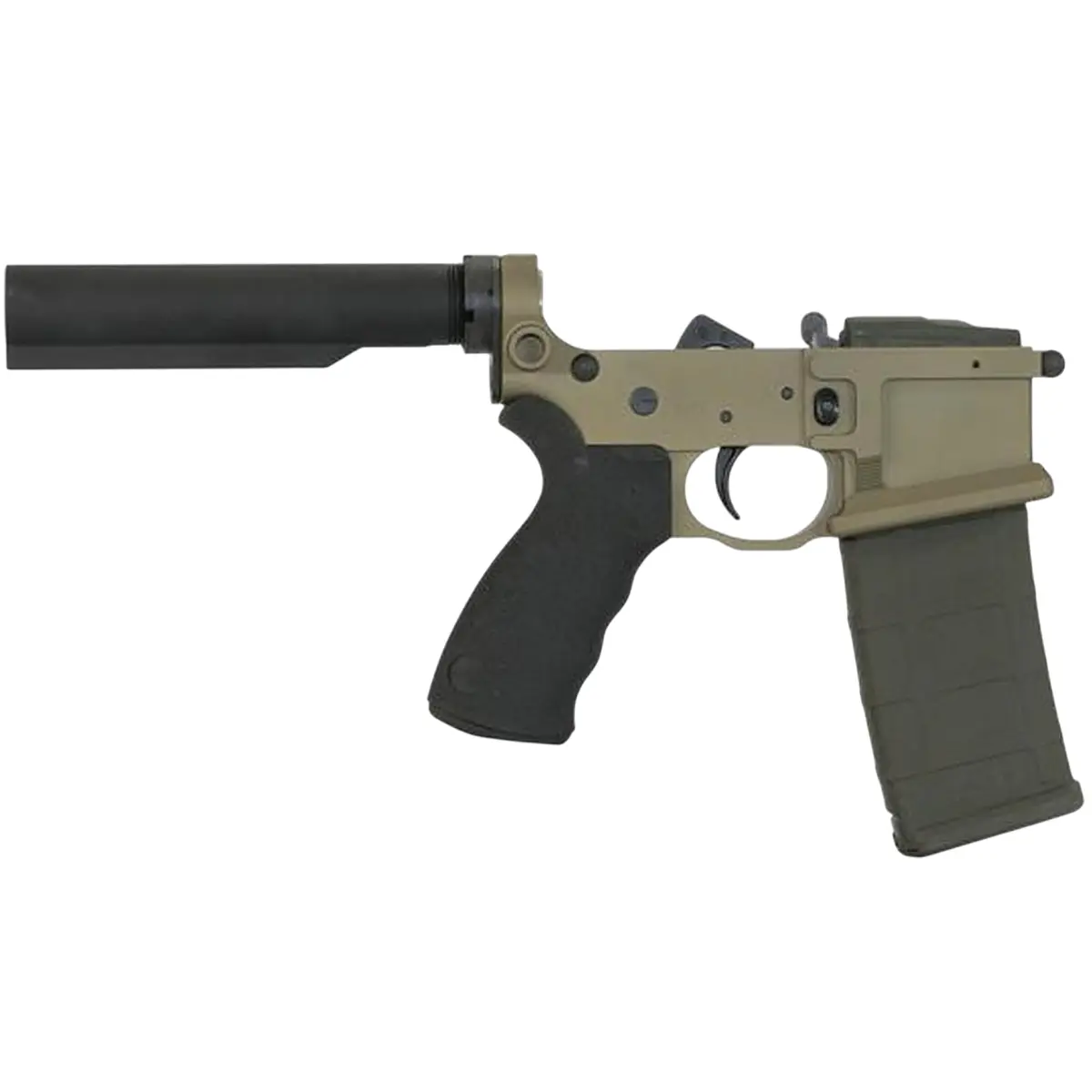 The integral trigger guard is over-sized to allow room for larger hands or gloves. The front of the magazine well is also textured to allow it to be used as a grip for forward support. These Built Lower Receivers come with a carbine length, 6-position collapsible stock buffer tube without any stock installed. This allows the customer to install whatever stock they prefer without paying for a generic one that they may likely remove anyway.